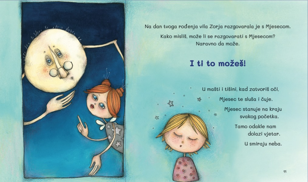 Vila Zorja pomoćnica je oblacima. Na dan tvoga rođenja prosipala je sjajnu prašinu po livadama zato što je sve na svijetu znalo da baš ti toga dana započinješ život na našem planetu. Stari mudrac Mjesec slavio je tvoje rođenje i znatiželjnoj vili Zorji otkrio tajnu kako je komadić neba dospio u svako dijete i čemu služi.